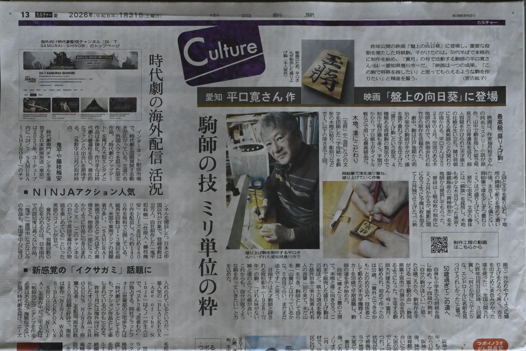の重要な役割の将棋駒を製作しました。寛月師は多くの駒師の中から映画のスクリーンの大写しにも映える確かな技術を見込まれての製作です。