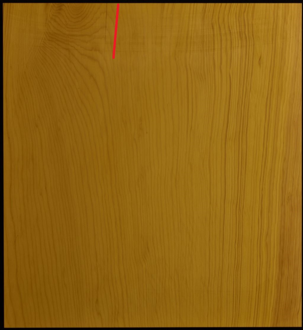 品質には老舗の自信があります。 本榧(日本・日向産) 柾目一枚板 サイズ371x340x43ミリ本漆太刀目盛画像の現品をお届けします。 №1 №2 №3 №4 赤線の左に浅いワレがあります。