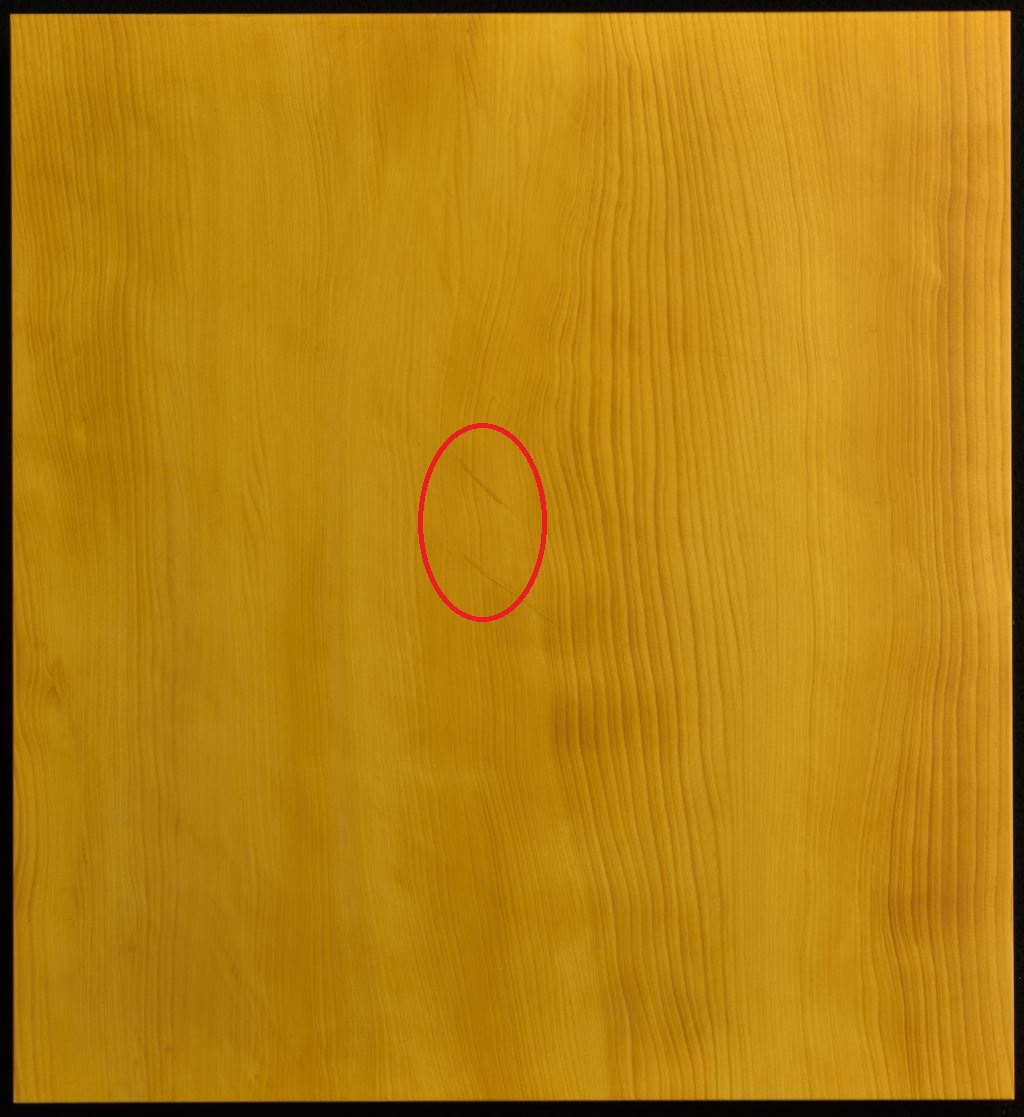 品質には老舗の自信があります。 本榧(中国産) 一枚板 サイズ370x340x59ミリ本漆太刀目盛画像の現品をお届けします。 №1 №2 №3 №4 赤丸の中に浅いヒビがあります